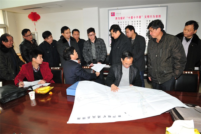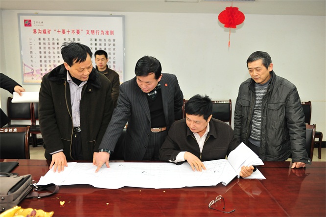 尹正柱等公司領(lǐng)導(dǎo)在給檢查團專家匯報礦井接續(xù)問題