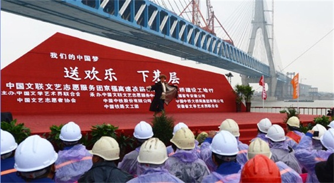 12月16日,在世界在建跨度最大的公鐵兩用斜拉橋——京福高鐵銅陵長(zhǎng)江大橋合攏之際,中國(guó)文聯(lián)黨組成員、書(shū)記處書(shū)記李前光同志等50多位藝術(shù)家和文藝工作者赴大橋建設(shè)工地,開(kāi)展“我們的中國(guó)夢(mèng)——送歡樂(lè)下基層”文藝志愿者服務(wù)活動(dòng)。