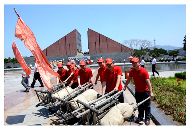 沂蒙山老區(qū)人民支前小車隊雕塑前合影