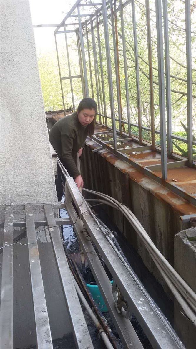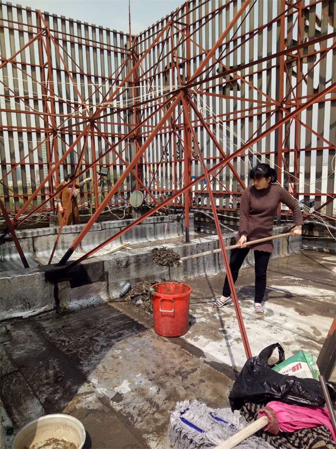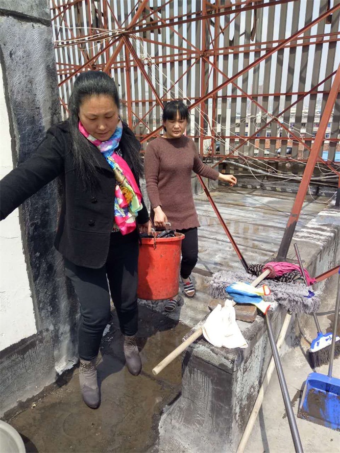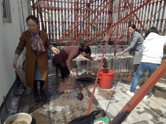 女工們?cè)谇謇?樓平臺(tái)上的雜物及垃圾