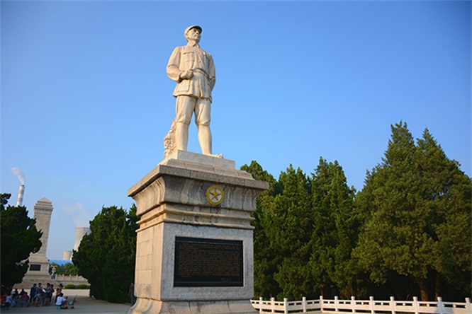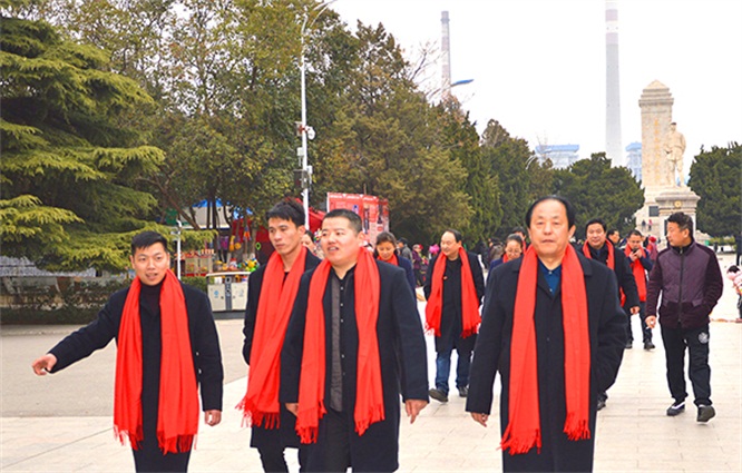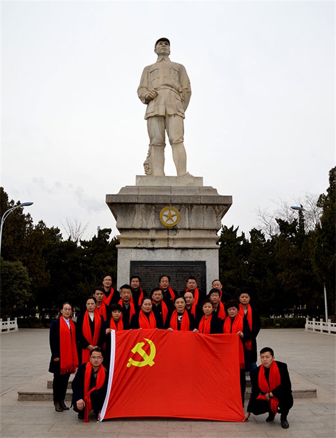 ▲公司機(jī)關(guān)黨員和入黨積極分子在彭雪楓雕像前合影留念