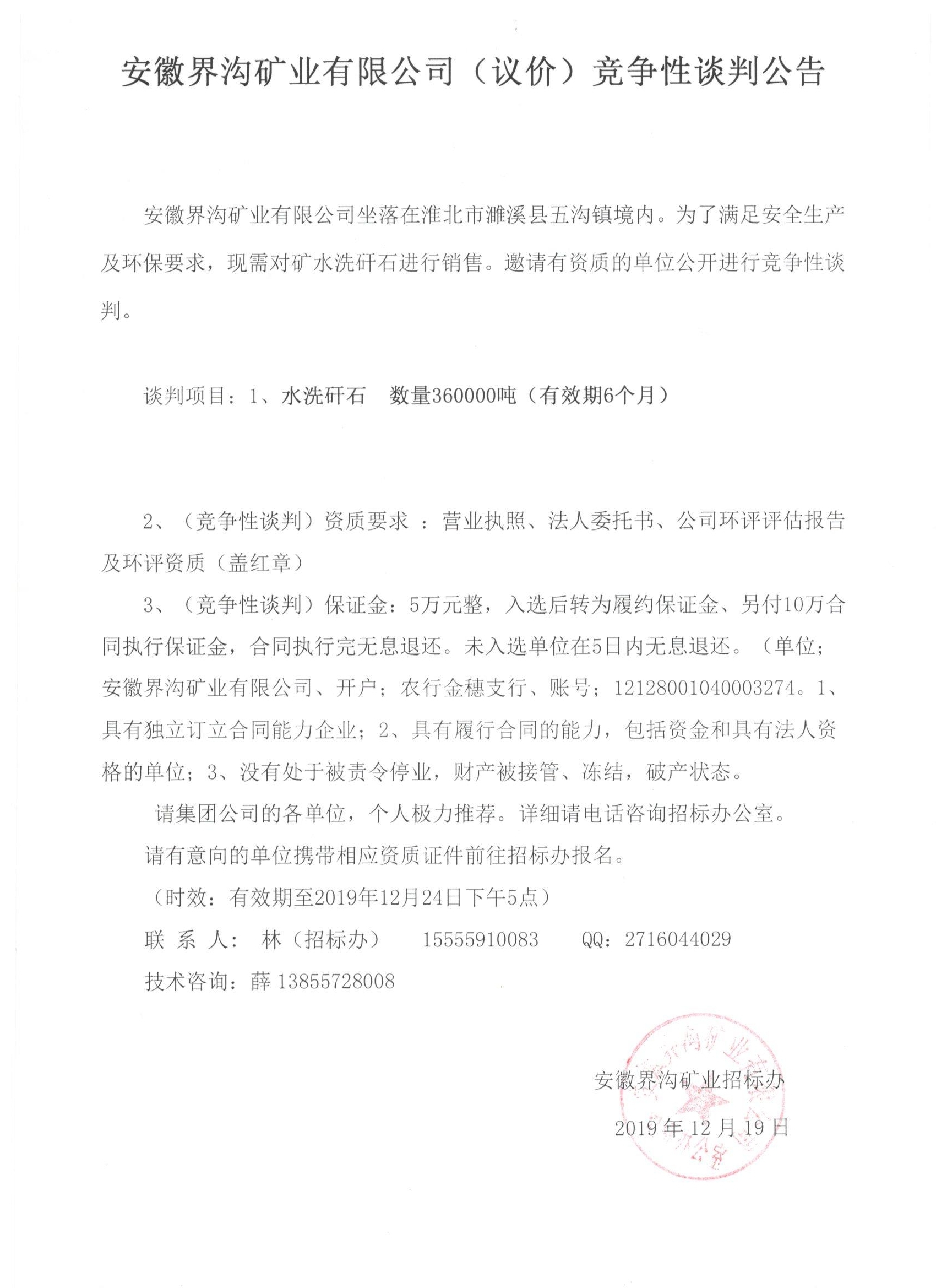 安徽界溝礦業(yè)有限公司(議價)競爭性談判公告