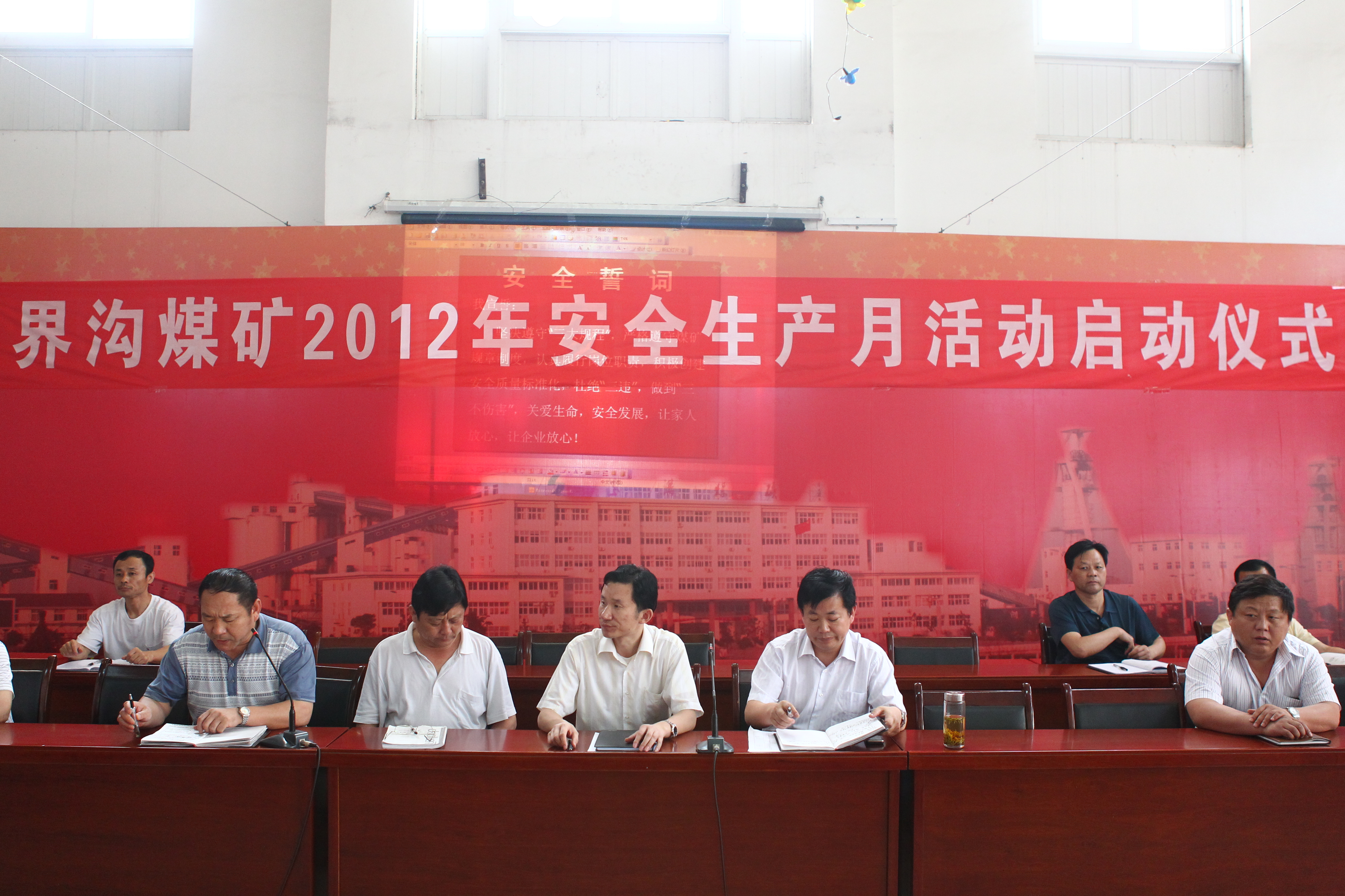 礦主要領(lǐng)導(dǎo)在安全月啟動(dòng)儀式主席臺(tái)上就座.